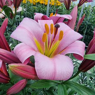 Trumpet lilies, also known as Aurelian lilies, are prized for the giant blooms, graceful form and bright colours they bring to summer gardens. The elongated flowers, which measure 4-5" across, grow on towering stems that reach 4-6' tall, making them recognizable from a distance. Due to the height of these lilies, the strong fragrance released by their elevated and plentiful blooms can perfume an entire yard. They come in an array of colours, and the reverse side of a bloom is often hued differently from the top. Trumpets reliably bloom in mid to late summer, returning each year with greater vigour and more of the exotic-looking flowers covering the plants. Popular in borders, we also suggest planting trumpets in groups of 3-5 to create spectacular focal points.
