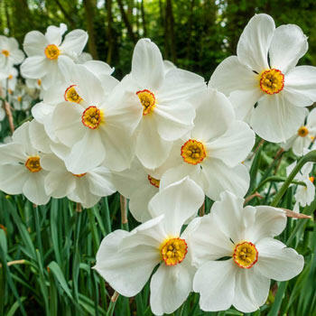 Does quite well in shady sites. Winner of multiple awards spanning 100 years, this fragrant beauty is beloved for its colouration, form and ability to withstand shaded, moist sites--rare among daffodils. Blooms bear white petals that surround a small, golden cup edged in rich red.
