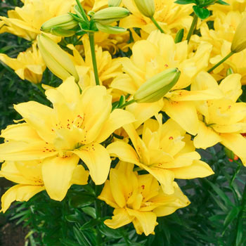 Yielding lots of double blooms atop strong stalks, this vigorous variety has an exceptionally long flowering period. Its up-facing, 5" blooms are bright yellow with maroon specks in the centre. Because they are pollen free, there’s no need to worry about allergies or staining. Perennializes well when left undisturbed.