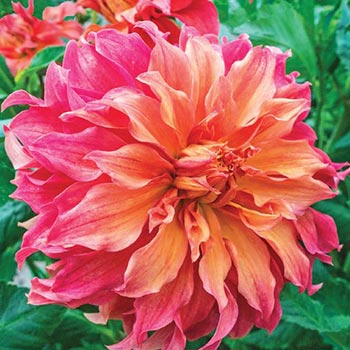 With island-inspired hues of hot coral-raspberry and sumptuous peach, this dahlia variety creates a tropical paradise right in your own back (or front) yard! The unique flower form features lush, silken petals that twist slightly at the ends. Fortunately, the 4' stems are sturdy enough to hold the massive, 10" blooms upright, keeping them visible from all angles.