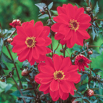 It's hard to say which is more attractive, the fiery red blooms or the deep purple-black leaves that surround them. Flowers are 4" in diameter with rounded petals that surround dark purple and yellow centres.