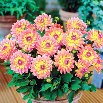 Plant this low grower in front borders, beds or patio pots, and get swept away by an abundance of 6" fully double, bicolour blooms. Yellow centres punctuate soft salmon-orange flowers.