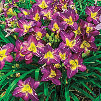 This highly fragrant rebloomer fills the garden with a delightful perfume noticeable from several feet away. Well-branched, well budded scapes ensure plenty of blooms during both its initial flush and again later in the season. Each diamond-dusted, lavender-mauve flower spans 6" and features a conspicuous citron throat and purple stamens. The triangular form emerges as the ruffled, recurved petals open wide and flat. An improved, larger version of the beloved Prairie Blue Eyes.