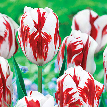 Painted flames of red adorn this creamy white beauty, giving it an artistic flair. Blooms start out buttery yellow but mature to white with a subtle iridescence to the petals.