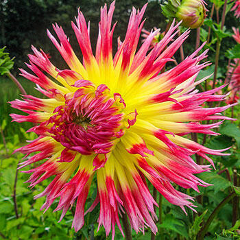 Very large, fully double, 8" blooms feature bursts of buttercup yellow and reddish pink. Petals are long and twisted with split tips, giving flowers a spidery appearance. Floriferous, fast-growing plant is great in a border or bouquet.