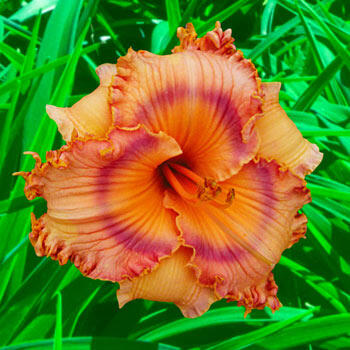 The distinctively outlined, orange appliqué throats of its heavily crimped trumpets catch the eye and refuse to let go. These amazing, 5¼" blooms also have grey-orange petals and sepals, a somewhat purplish eye and orange edges with prominent tentacles. The flower scapes of this refined rebloomer produce 20 buds on two branches.