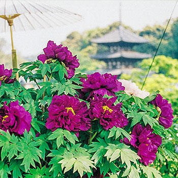 Considered one of the best tree peonies, its majestic, semidouble reddish-purple flowers are goblet shaped with silky petals and measure 8" across. Golden stamens provide dramatic contrast. Leaves are deeply cut into large, pointed lobes. Pleasantly fragrant.