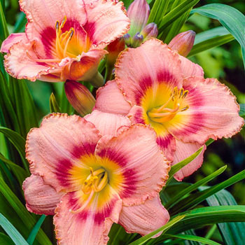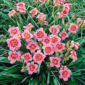 Multiple award-winning rebloomer is one of the very best! Its lengthy list of prestigious honours is topped by the 1998 Stout Silver Medal, the 1994 Annie T. Giles Award and the 1993 Don C. Stevens Award. The strawberry-pink blooms have rose-red eye zones, golden-green throats and outer petals that form a perfect circle.