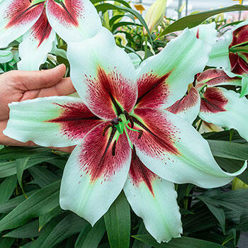 Its enormous, 12½-13" flowers are greenish white with large, deep red centres. An excellent perennializer that's an attention getter for humans and butterflies alike.Lilium OT-hybrid