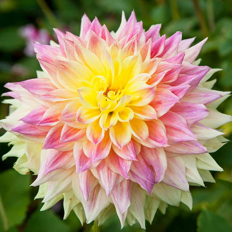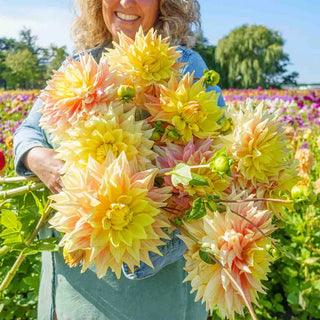 The salmon-pink petals fade to creamy yellow toward the tips. Thick stems steadily support the weight of the flowers and help make this dahlia exceptionally good for cutting.