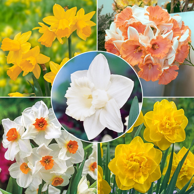 Enjoy waves of colour from very early to late spring with this expertly curated collection of five award-winning daffodils chosen for extended bloom and garden performance. Expect a lively blend of white, yellow, orange and pink flowers, some lightly fragrant, on plants ranging from compact to statuesque. Ideal for mass plantings, naturalizing or front to-middle borders, they thrive with some sun and deliver a polished, full look year after year.