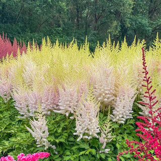Shadowy spaces get a much-needed glow-up with generous plantings of Milk and Honey Astilbe. This shade-loving perennial is sure to become a favorite of clients, gardeners AND pollinators! The easy-to-grow plants produce several fluffy, creamy white flower heads tipped in a fresh green hue. As time passes, the flowers change to soft pink, giving the area an entirely new look. Bushy, lightly marbled foliage creates a fine display even after the blooms are spent. Makes an ideal pairing with ferns or hostas. Deer and rabbits tend to avoid the flowers.