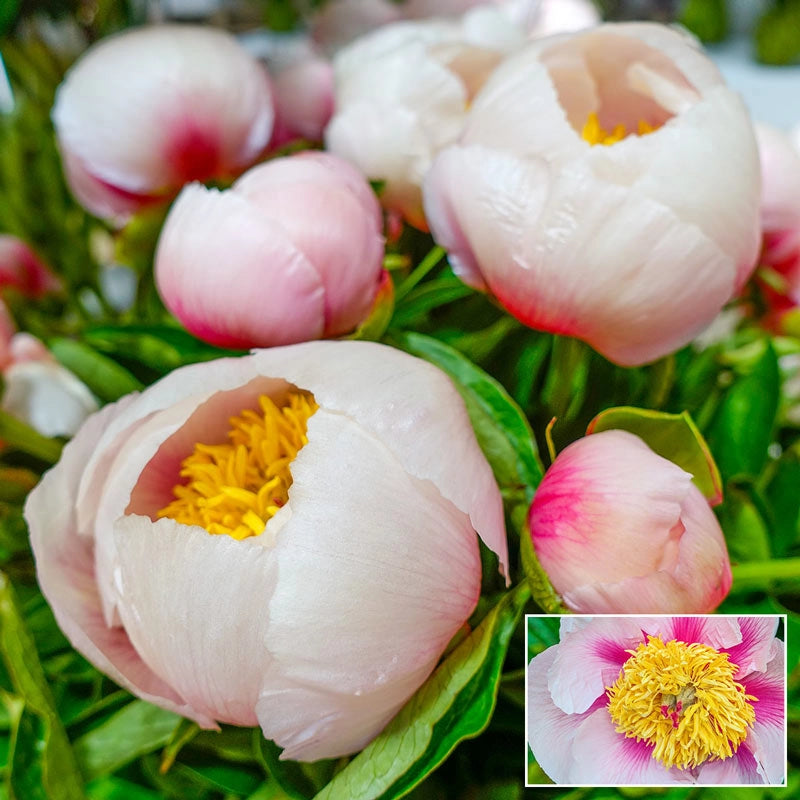 This beacon for pollinators releases a soft, sweet scent presenting a pollinator-friendly peony with extraordinary colouration, a vigorous growth habit and sturdy stems that help blooms resist springtime rains. The 4–6", single flowers are a unique blend of ivory-white and apricot-yellow, with coppery tones and pink at the base. Golden-yellow stamens pack their centres. A lush, bushy mound of glossy, dark green foliage plays up the blossoms, which are highly attractive to butterflies, honeybees and other vital pollinators. Early flowering.