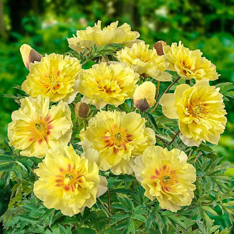 Another successful crossing of a tree peony and a bush peony, this incredible Itoh variety delivers extra-large, uniquely yellow blooms on a robust, winter-hardy plant. Strong stems hold the fragrant flowers upright, even after a heavy rain! Glossy, green foliage starts out copper-burgundy in the spring and provides interest throughout the season.