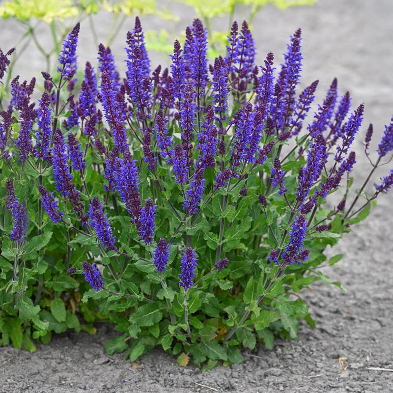 Intense violet-blue flower spikes rise from purple stems and aromatic foliage to create a striking summer display that draws butterflies and other pollinators. Slender, crowded trumpets add texture and release a light fragrance, making this salvia a nice option to plant close to a seating area. Hardy and drought tolerant once established, it forms a tidy plant no more than 16" tall ideal for sunny borders or planter settings.