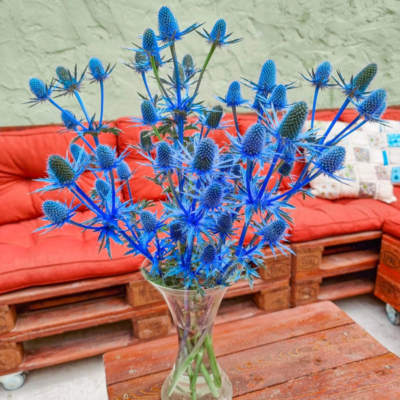 Unique colouration and eye-catching flower form lights up the landscape. Iridescent metallic blue flowers and stems sparkle, even from a distance, and add the wow factor to cut-flower displays. Boasts larger blooms than other sea holly varieties—and bees and butterflies love them. This drought-tolerant perennial packs a lot of punch and requires so little care during the growing season.