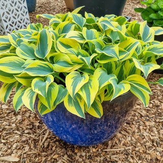 Blue foliage features broad bands of yellow along each leaf edge. The margins may change to creamy white with age, but the leaves remain colourfast through the long growing season. This slug-resistant hosta keeps its mounded shape and bright colours longer than most. PP24009