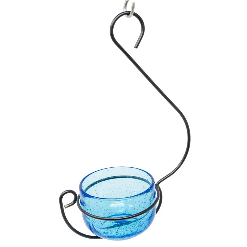 Who says bird feeders can't be attractive? This new feeder combines a utilitarian purpose with decorative appeal in a unique design sure to become a favorite of bird lovers around the country. A pretty, blue bowl accented with tiny bubbles holds your birds' preferred food—ideal for seed, jelly, fruit or mealworms. A gracefully curved iron holder gives the feeder an even more elegant look. Attracts Orioles, Juncos, Finches, Bluebirds and more! Removable bowl for easy cleaning and refilling. 9¼"Hx3½"Wx6"D