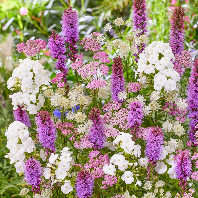 Our new Bridal Bouquet Perennial Blend captivates gardeners, clients and homeowners with its unique mix of elegant white Tall Phlox and purple Liatris spicata, and the more rustic white Astrantia and pink Achillea millefolium varieties. The fragrant mixture lures pollinators and butterflies to sunny borders, containers and cutting gardens over an extended blooming period. Planted in full sun with well-drained soil, it produces enough diverse blooms during the summer season to enjoy in the landscape as well as in long-lasting cut-flower bouquets.