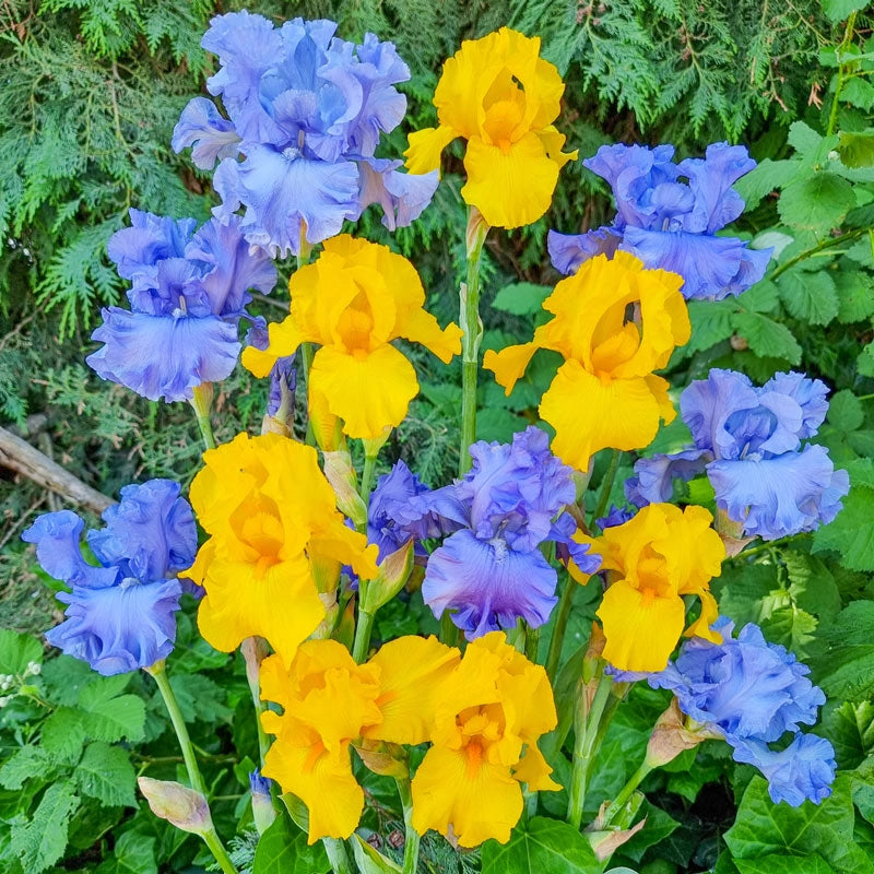 Each bloom in this transcendent mix paints a vivid tapestry that evokes the serenity of the deep blue sea and the warmth of the springtime sun. These low-maintenance irises quickly adapt and thrive, offering an ever-increasing display of blooms over time. They add elegance to garden beds, borders, and flower arrangements. Varieties are not individually labeled.