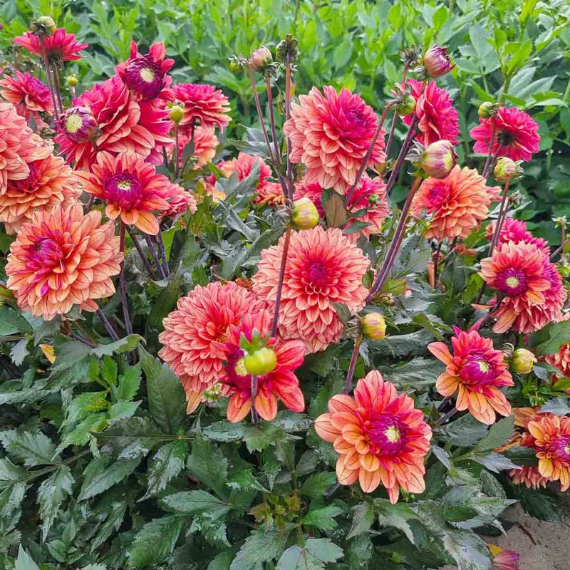 Warm cinnamon-orange petals with soft peach tones and subtle reddish-purple striping give these double blooms an artistic effect that stands out in borders and bouquets. The flowers span 4–4½", held aloft on strong stems above neat, compact plants with rich green foliage. Ideal for smaller spaces, this dahlia adds depth and colour without overwhelming.