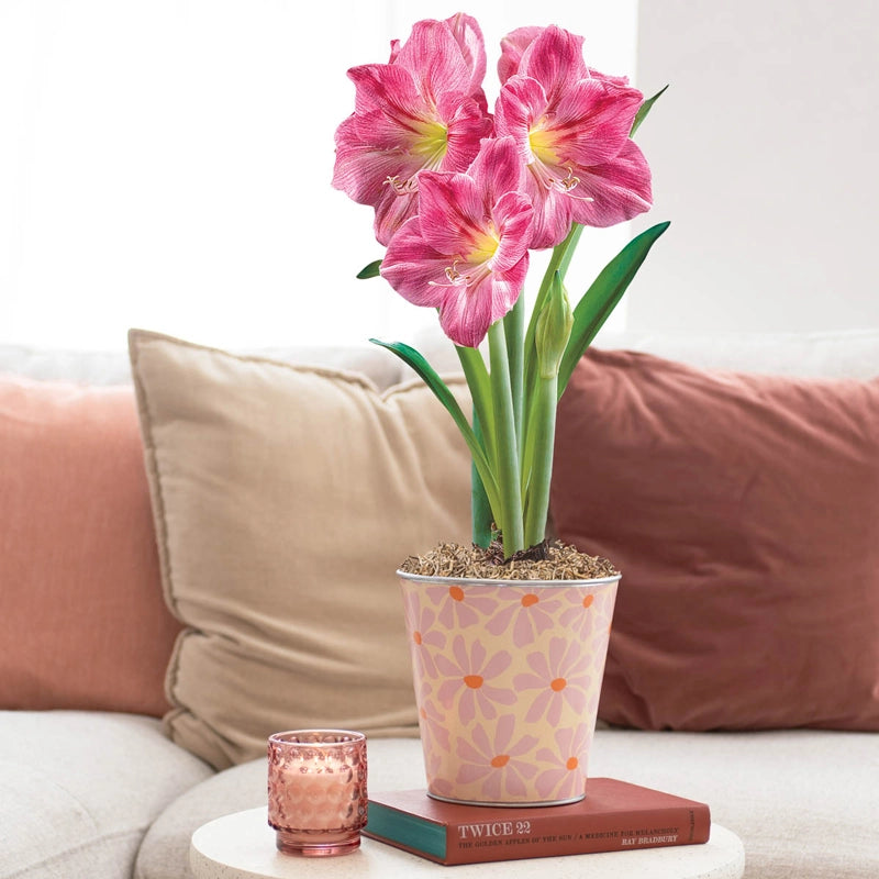 Welcome spring with a burst of playful color. This growing gift features Candy Floss Amaryllis, celebrated for its huge, mauve-pink blooms that can reach nearly 9" across. As sturdy green stems rise, the flowers open wide to reveal softly shaded petals that are both cheerful and eye-catching. Easy to grow and long-lasting, it's a joy to watch come into bloom.