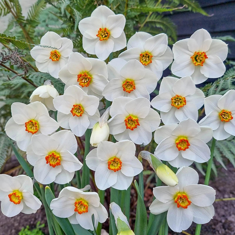This radiant flower features clear white petals dotted with a small, yellow cup adorned by a reddish-orange rim and green throat. The overall look is at once striking and sophisticated. Paired with a mix of more colourful springtime blooms, either in a seasonal bed or as a freshly cut bouquet, it makes a spectacular showing. Because it naturalizes well, it will flourish in woodland areas.