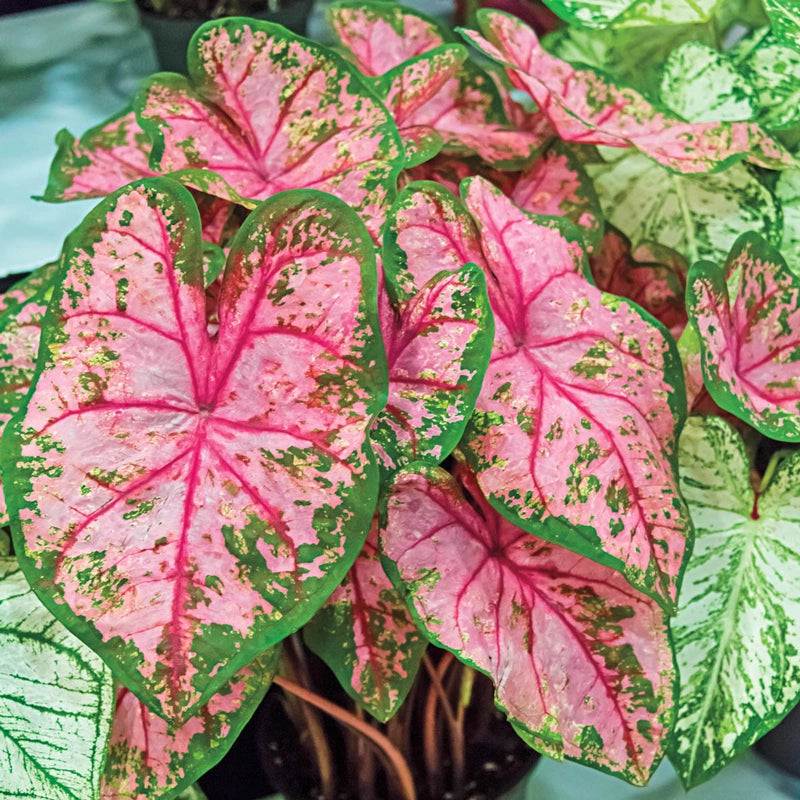 Here’s a caladium that transforms shaded corners into tropical sanctuaries with its massive heart shaped leaves splashed in vibrant pink and accented with deep green borders, and striking red veining. This shade-loving plant thrives along woodland paths, beneath tree canopies and as dramatic centrepieces in containers, adding a burst of colour from midsummer through autumn without demanding full sun or excessive maintenance.