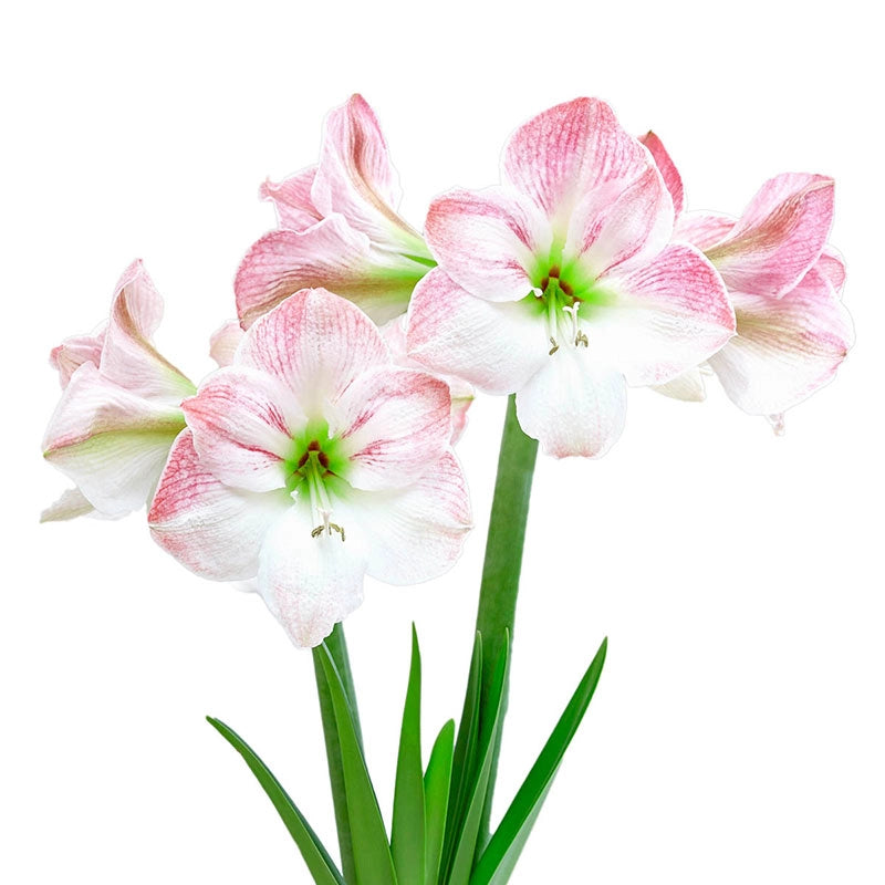 Though snow may be swirling outside, the promise of the coming spring is alive and well thanks to Cherry Blossom Amaryllis. Stunning 6" white blooms are blushed with soft pink and appear within 6-8 weeks of arrival on 18-20" stems. A fantastic bloomer, it bears up to 12 blooms per bulb.