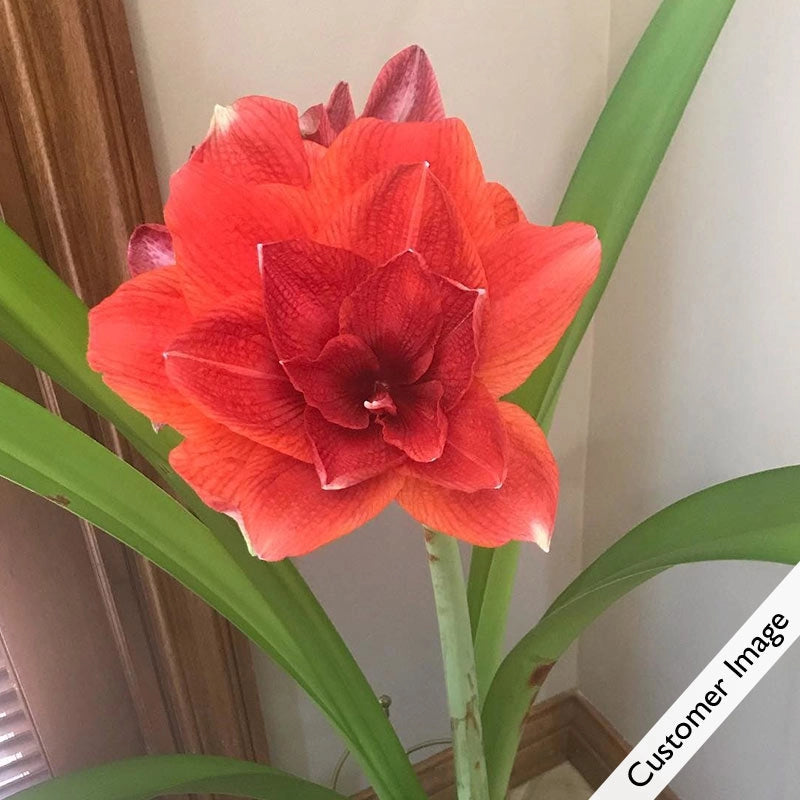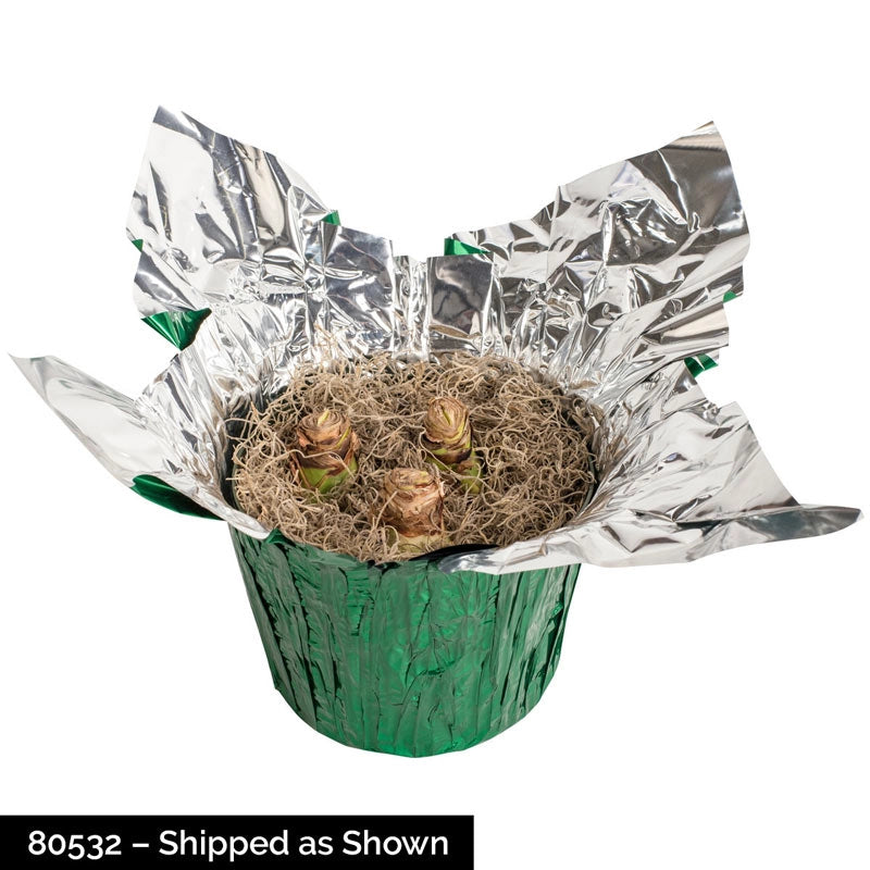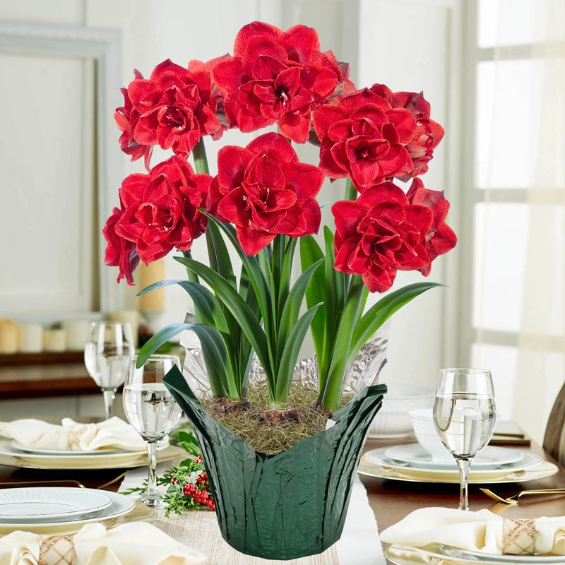This big, bright, double amaryllis pops in a cheery, cherry-red hue and features saucy ruffled edges tipped in snowy white. It's the perfect holiday coloration! It makes a lovely table centerpiece or mantel décor surrounded by dark evergreen boughs or twinkling lights. Your choice of one or three premium bulbs will be carefully planted in a green foil-wrapped pot that's ready for growing or giving throughout the holiday season. Each bulb will produce 1-2 stems, with at least four stunning blooms per stem appearing 6-8 weeks after arrival. Detailed instructions included for blooming this year and in years to come. Single: 6" grower's container; Triple: 8" grower's container.