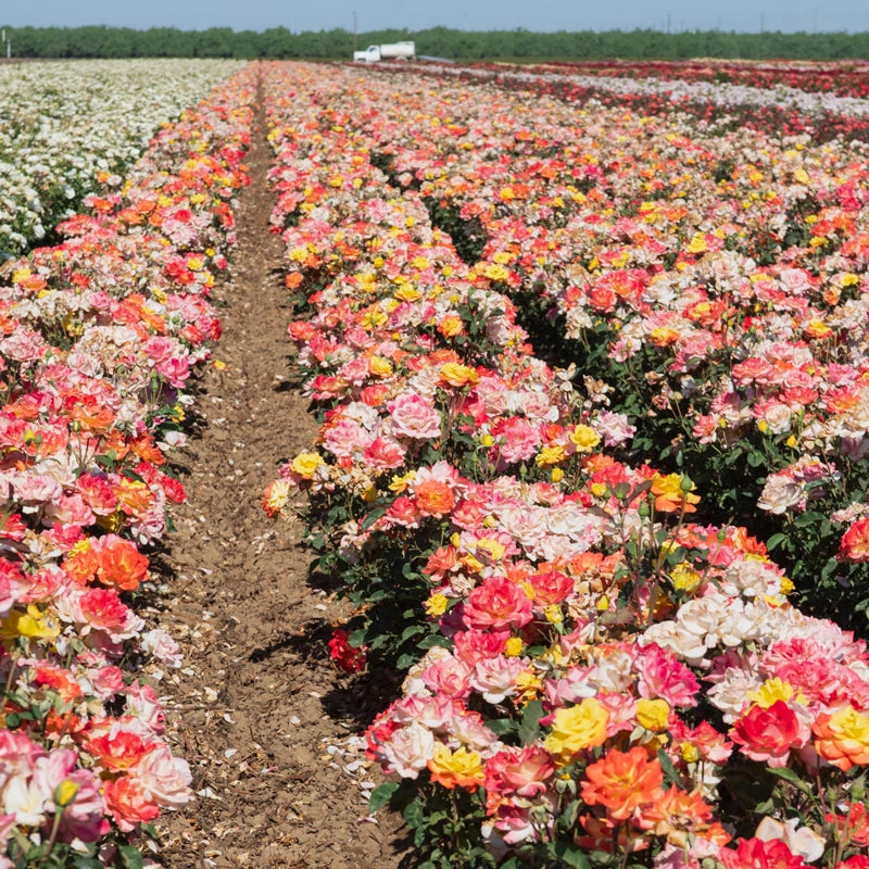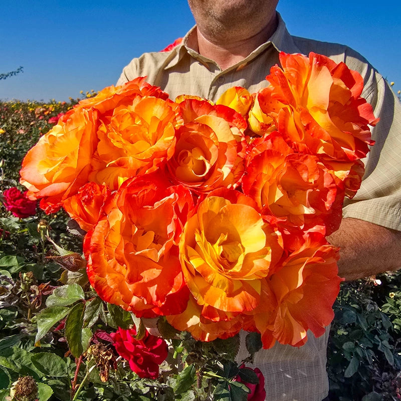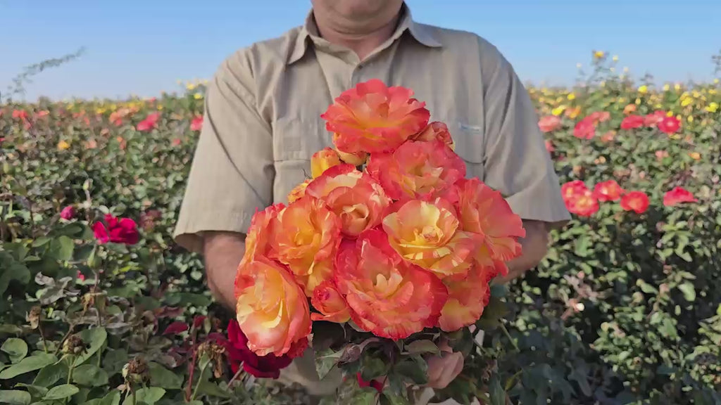 Named for glass sculptor Dale Chihuly, this vivacious floribunda mirrors the master’s flair for bold colours and striking forms. Pure yellow buds unfurl into radiant orange-blushed blooms, culminating in deep crimson tones before fading. Each double flower spans 3–3½" across, packed with about 25 fragrant petals.