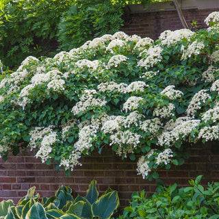Planted near a structure, such as a fence post, stone wall, even a large tree, this unique hydrangea will climb skyward with little encouragement. Glossy, deep green foliage creates a dense backdrop for the creamy white summer blooms. Use as a flowering ground cover to fill bare spaces with colour and texture. May be slow to establish, but is well worth the wait. Carefree and long lived.