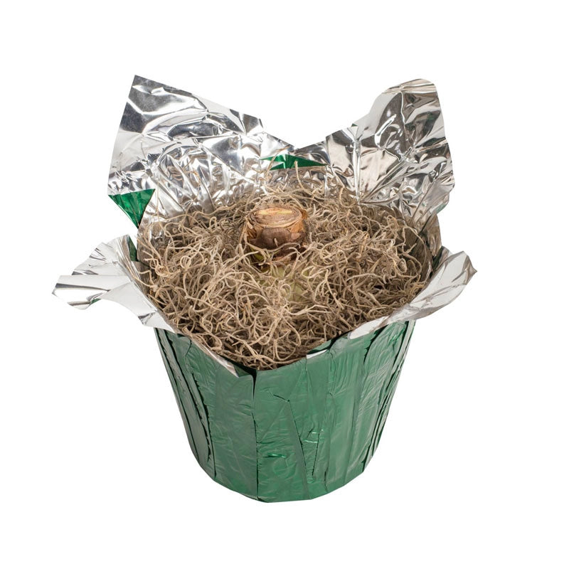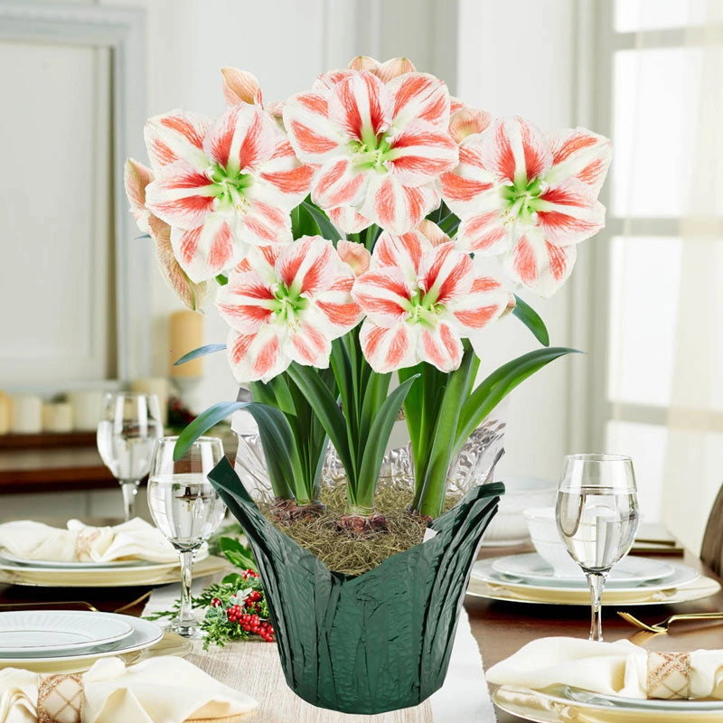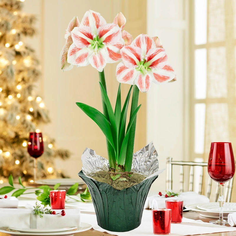 Is this amaryllis red with white stripes or white with red? Either way, its surprising pattern will bring joy to any holiday home or office. Chartreuse green centers finish off the festive look. Pairs perfectly with striped Holiday Star. Ships in a 6" nursery pot wrapped in green foil for gift giving throughout the season.