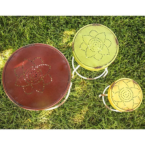 You enjoy spending time on your patio—and so do your potted plants! These decorative plant stands, which are hand painted and designed to resemble vintage stools, add visual excitement to almost any decor setting. Each of these three rustic stands has a sheet-metal seat with an artsy flower design formed by punched holes. Great for use indoors, or place them outside on a patio or covered porch. Stands can also be used to display decorative items. Set includes small, medium and large plant stands. Small stand: 12"h, 6¼" dia. Medium stand: 15½"h, 8¾" dia. Large stand: 18¾"h, 10¾" dia.