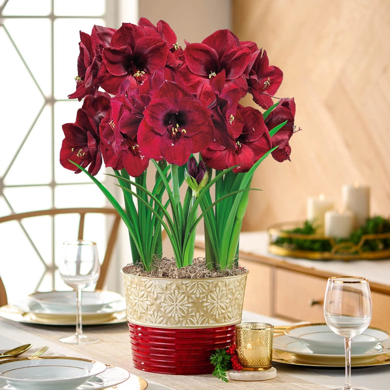 This deep red-wine bloom delivers drama galore, especially when paired with our elegant maroon and gold metal pot with embossed detailing. Long a customer favorite, our Colossal Benfica Amaryllis is true to its name, producing immense flowers up to 8" across. A prolific bloomer, it can bear up to 5 flowers per stem. Our triple planting is massive and makes a real statement—as a centerpiece or in an entryway. EXCLUSIVE (Triple: 7"h, 9½" dia.)
