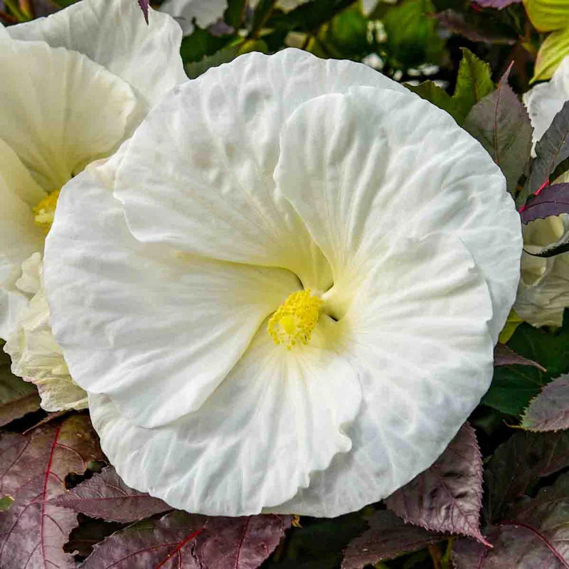 The matte, near-black foliage is beautifully complemented by the pure white, 6–7" blooms. The slightly cupped flowers cover the entire robust plant. Not only does this variety bloom earlier and longer than traditional hibiscus, but it also blooms reliably up to Zone 4. Exceptionally sturdy and compact, and emerges later in spring than most perennials.PPAF