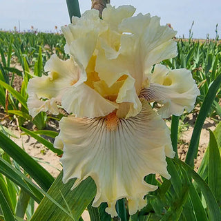 This stunner exhibits shades of lemon, apricot buff and subtle wineberry. Its wide, ruffled falls are edged in a deeper yellow that envelops the veining.