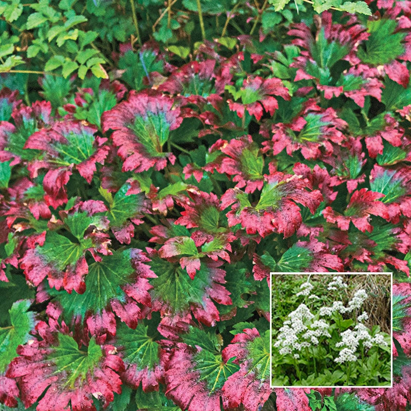 In mid spring, this mukdenia bears lovely, white, half-inch blooms on branched panicles that attract pollinators, but the real attraction is its foliage. The leaves are green in spring, but soon red highlights appear. By fall, the leaves turn entirely red. Crimson Fans can be used as a colourful, deer-resistant ground cover in semi-shaded spots beneath trees, between shrubs and in rockeries. Also looks great in a container garden.