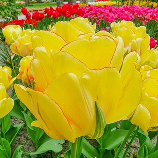 Named for Japanese Sumo wrestler, Akebono Taro, this late-blooming tulip effectively extends the spring flowering season with opulent, yellow blooms accented with a fine red edge and apple-green streaks. We find it particularly striking when planted in groups, but it also wows in borders and containers. A great border variety, it livens up late-spring displays with renewed color.