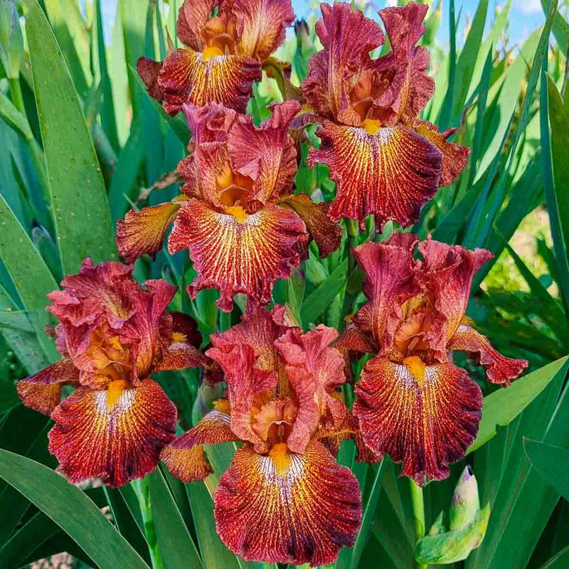 Here's an elegant stunner boasting fiery brick-red flowers kissed by hints of white and yellow around the beards. Its streaked pattern adds a touch of the unexpected, making it a true standout in the garden. Dash of Spice's sturdy, compact stature and year-round ornamental foliage are rare traits among irises.