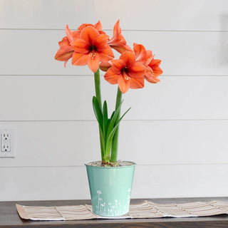Talk about an orange crush—we are head over heels for this dreamy amaryllis shade that's part citrus and part spice. A premium 26–28 cm Desire amaryllis bulb arrives ready to sprout in our pale green pot with embossed floral pattern, allowing the impending and impressive blooms to become the center of attention. This lovely living gift includes simple care instructions for blooms this season and beyond. Gift it to a cherished friend or family member. EXCLUSIVE. (6"h, 6½" dia.)