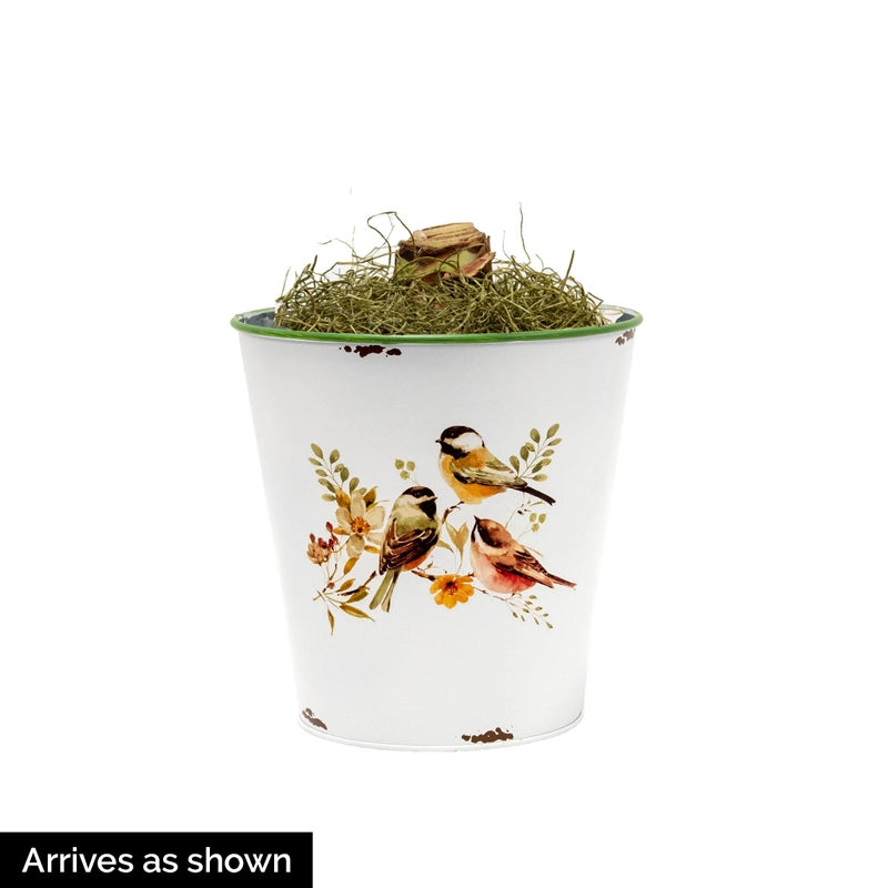 Adding to its natural beauty is our white metal pot decorated with sweet and sociable songbirds, a cheerful companion to the glowing blooms above. Makes a bright and uplifting gift for bird lovers or anyone who appreciates eye-catching color. EXCLUSIVE. (6¼"h, 6¼" dia.)