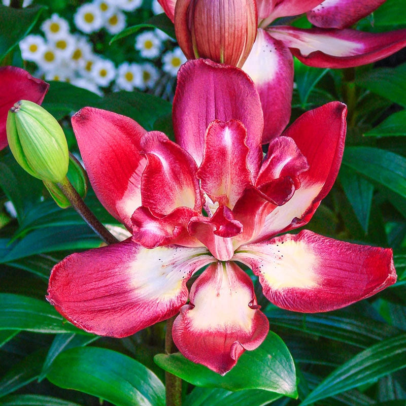 Possesses extraordinary flower form, an irresistible fragrance and, for a double lily, a unique colouration. Semi-double 4" flowers are accented by pale red petals with a large, white base.