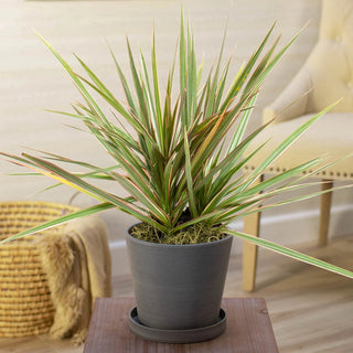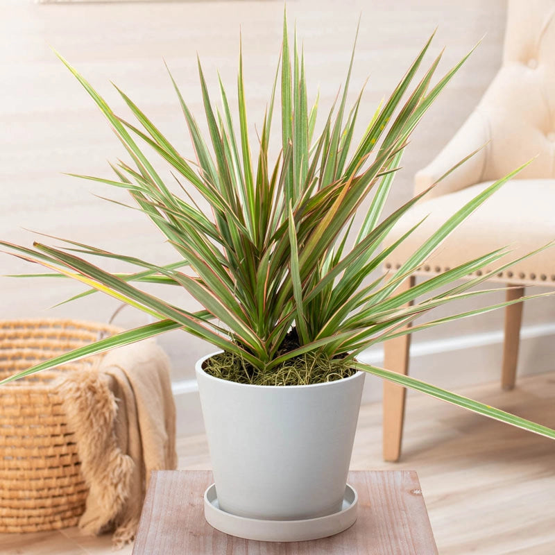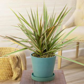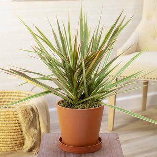 Inviting this tough, spiky-looking plant into one's home gives new meaning to the term "tree house"! By the time it matures, Dracaena Marginata bears hundreds of sword-like, green leaves with red banding along the edges. The lower leaves eventually drop away, revealing a thin but sturdy trunk. Because this unique plant resembles a sapling and is native to the island country of Madagascar, Dracaena Marginata is commonly called Madagascar Dragon Tree or simply Dragon Tree. Usually grown in a pot as an air-purifying houseplant, it reaches a mature height of 3-6' indoors. But people living in the warmest U.S. climates (zones 10-11) can plant it outside, where it will grow considerably taller--up to 20'. In spring, this variety bears small but fragrant, white blossoms (although usually not when grown indoors) that give way to round, yellow-orange berries. This robust, almost unkillable plant resists drought and can thrive for years with little maintenance. Pets should be kept away from the foliage, which is toxic to animals.