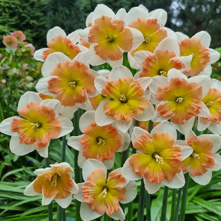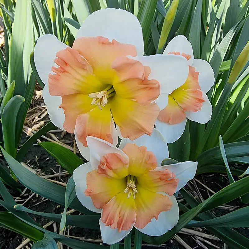Demanding attention with its spectacular 4" blooms, this extraordinary daffodil combines pristine white petals with an intricately ruffled corona. The soft primrose-yellow cup is strikingly edged in rose-pink tones. It excels in mixed borders, where it can be positioned behind lower-growing spring bulbs. The long-lasting blooms make exceptional cut flowers for indoor arrangements.