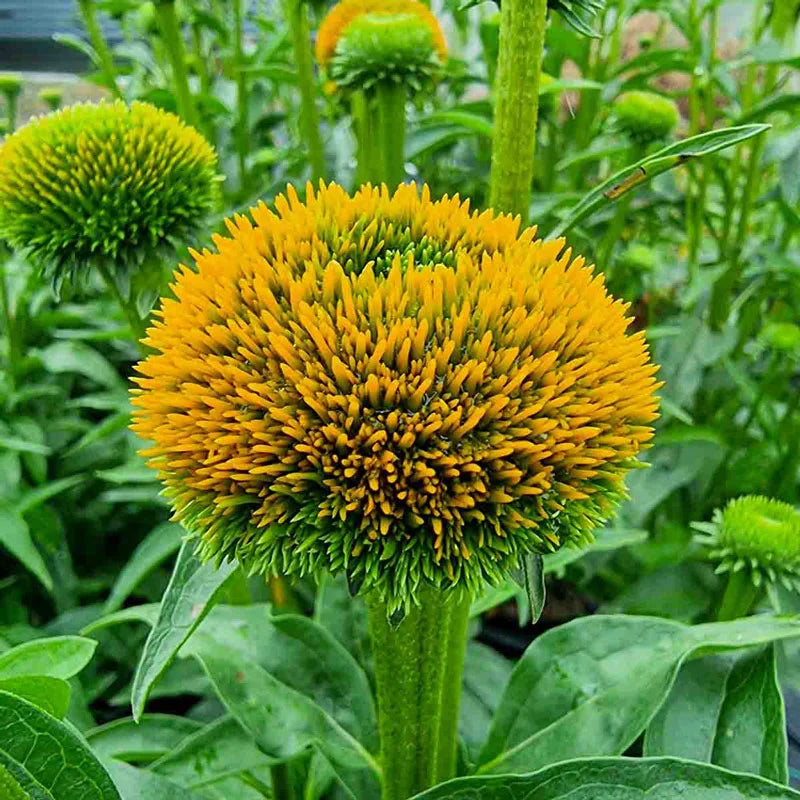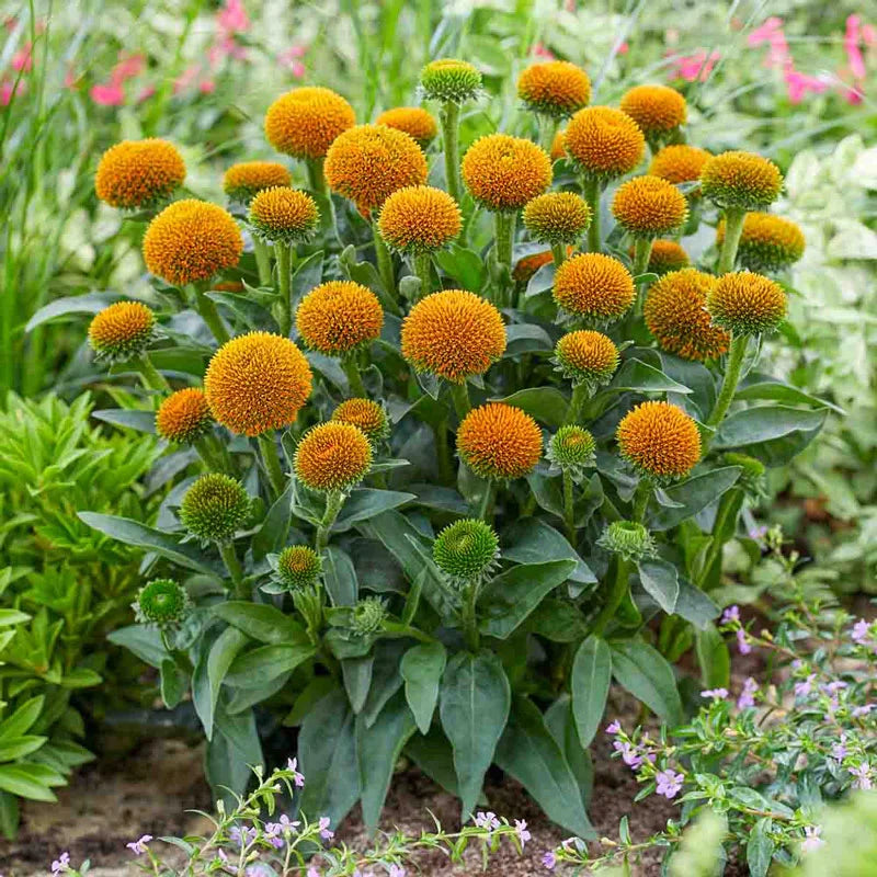 With a compact, upright habit and remarkably strong stems, this drought-tolerant coneflower makes a striking addition to sunny beds and borders. Its unusual orange-yellow cones are petal free, giving the blooms a sculptural, modern look that holds up well in the garden or a vase. Plants grow to up to 28" and produce multiple stems topped with long-lasting blooms that are a hit with pollinators. Hairy foliage adds texture, and the extended bloom time keeps the display going through the season.