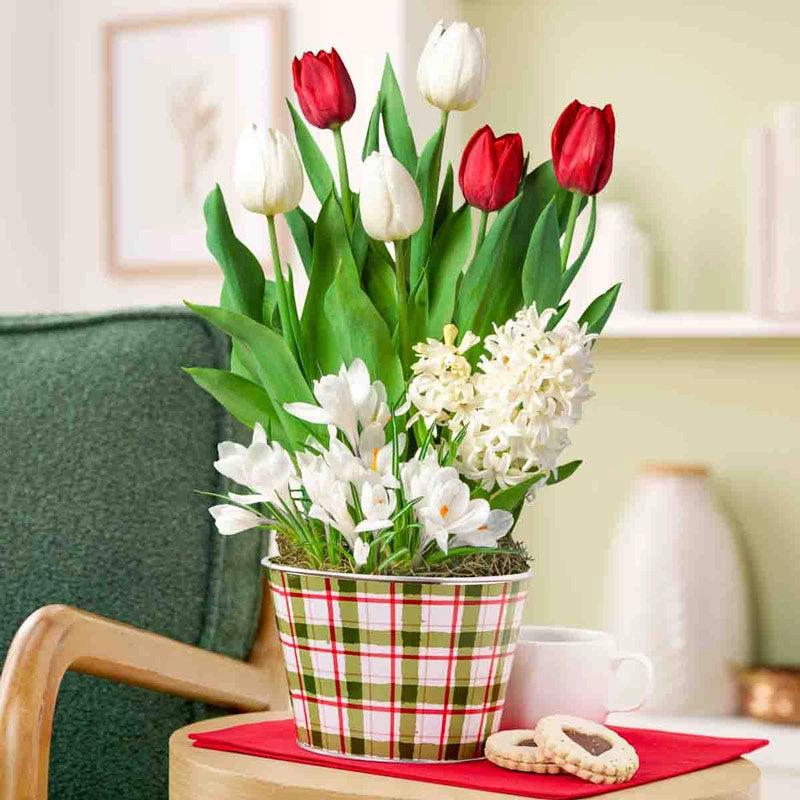 Brimming with classic beauty and bursting with color, this charming tabletop garden brings the joy of the season indoors. An early flurry of snow-white crocus and fragrant hyacinths sets the stage, soon joined by classic Dutch tulips in crisp white and merry red. Set in a plaid pot it's a joy to watch grow, especially when the weather is wintry outside. Its homespun touch makes it perfect for dressing up a windowsill or gifting a little magic to someone special. With its sweet scent and spirited palette, it's a playful nod to winter wonder and holiday delight. Includes 5 Jeanne d'Arc Giant Dutch Crocus, 1 White Pearl Hyacinth, 3 White Marvel Tulips and 3 Seadov Tulips. EXCLUSIVE. (4½"h, 6½" dia.)