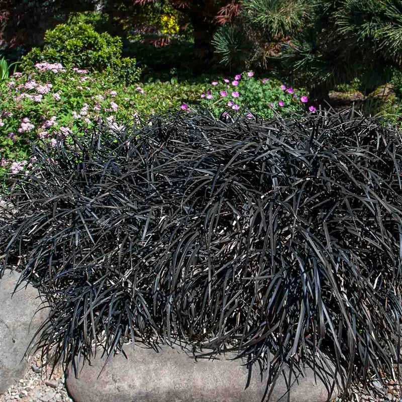 Edge of Night Mondo Grass Add bold style to your garden with Edge of Night Mondo Grass. This refined selection of black mondo grass features dark, glossy foliage accented by a narrow white edge—offering crisp contrast that elevates shady spaces and modern planting schemes. Low-growing and dense, it's ideal for borders, containers, or between stepping stones.