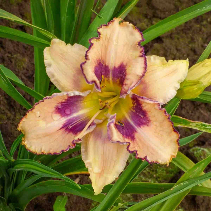 Massive 8" blooms in light cream are dressed with a silvery lavender-blue eye and matching picotee edge, making this rebloomer a standout in any setting. With 28 buds on four well-branched scapes, it’s remarkably floriferous and a real magnet for pollinators. Plant it in generous drifts or along a path where its showy form can be fully appreciated.