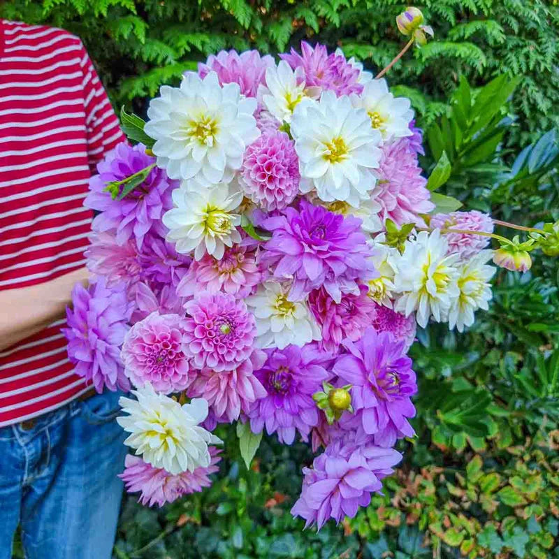 In this expertly curated blend, four dazzling dahlia varieties are showcased in an arresting palette of pinks, lavenders and whites. From frilly ball types to showy decorative blooms, the delightful mix of petal forms and radiant hues makes a sensational statement in bouquets, group plantings or back borders. Blending seamlessly, these showy stunners add an unmissable pop of colour and charm wherever you flaunt their exquisite blooms. Varieties are not individually labeled.